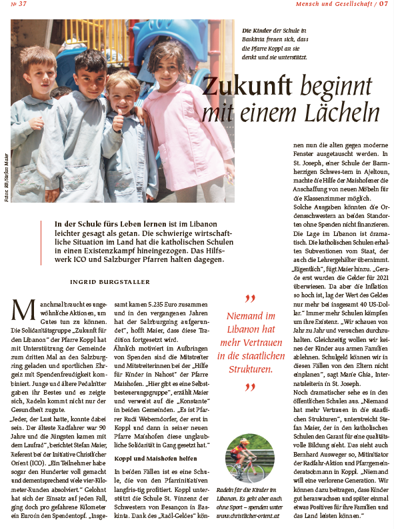 Im unten downloadbaren Artikel finden Sie mehr über das große Engagement und die gelebte Solidarität zweier Solidaritätsgruppen in zwei Salzburger Pfarren für zwei verschiedene Ordensschulen im Libanon:
